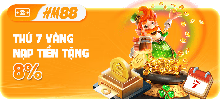 Trong thời gian diễn ra sự kiện, vào thứ 7 hàng tuần người chơi nạp tiền tại HM88,com sẽ nhận thêm 8% tổng giá trị tiền nạp. Không giới hạn số lần nạp và phương thức nạp.